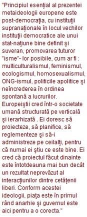 Uniunea Europeana are un steag pe care nimeni nu-l saluta, un imn pe care nimeni nu-l canta, un presedinte pe care nimeni nu-l cunoaste, un parlament , la Strabourg, caruia nimeni (in afara de proprii sai membri) nu vrea sa-i incredinteze putere (putere care ar trebui luata de la parlamentele nationale), o capitala, la Bruxelles, a unei birocratii inchegate pe care nimeni nu o admira, nici nu o controleaza, o moneda care presupune ceva ce nu exista sau nu va exista curand – un guvern central european, si reguli de comportament financiar pentru ignorarea carora niciun stat mebru nu a fost penalizat. Moneda Euro presupune si promoveaza o fictiune - ca “Europa” ar deveni, cumva, impotriva vointei majoritatii europenilor, mai degraba o expresie politica decat una geografica.